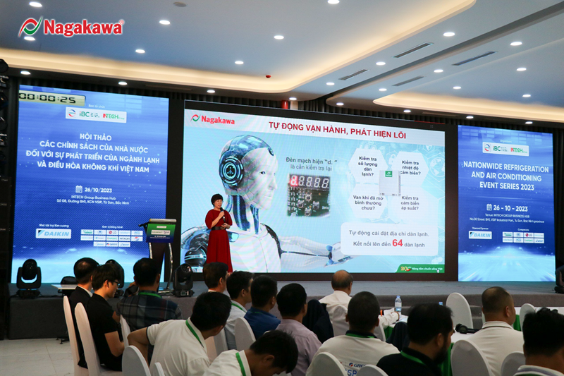 Bà Trần Bảo Châu – GĐ Chiến lược và Marketing TĐ Nagakawa – đại diện cho các thương hiệu điều hòa không khí nội địa tham luận tại sự kiện, trình bày những giải pháp công nghệ tiên tiến của Nagakawa ứng dụng trong điều hòa không khí.