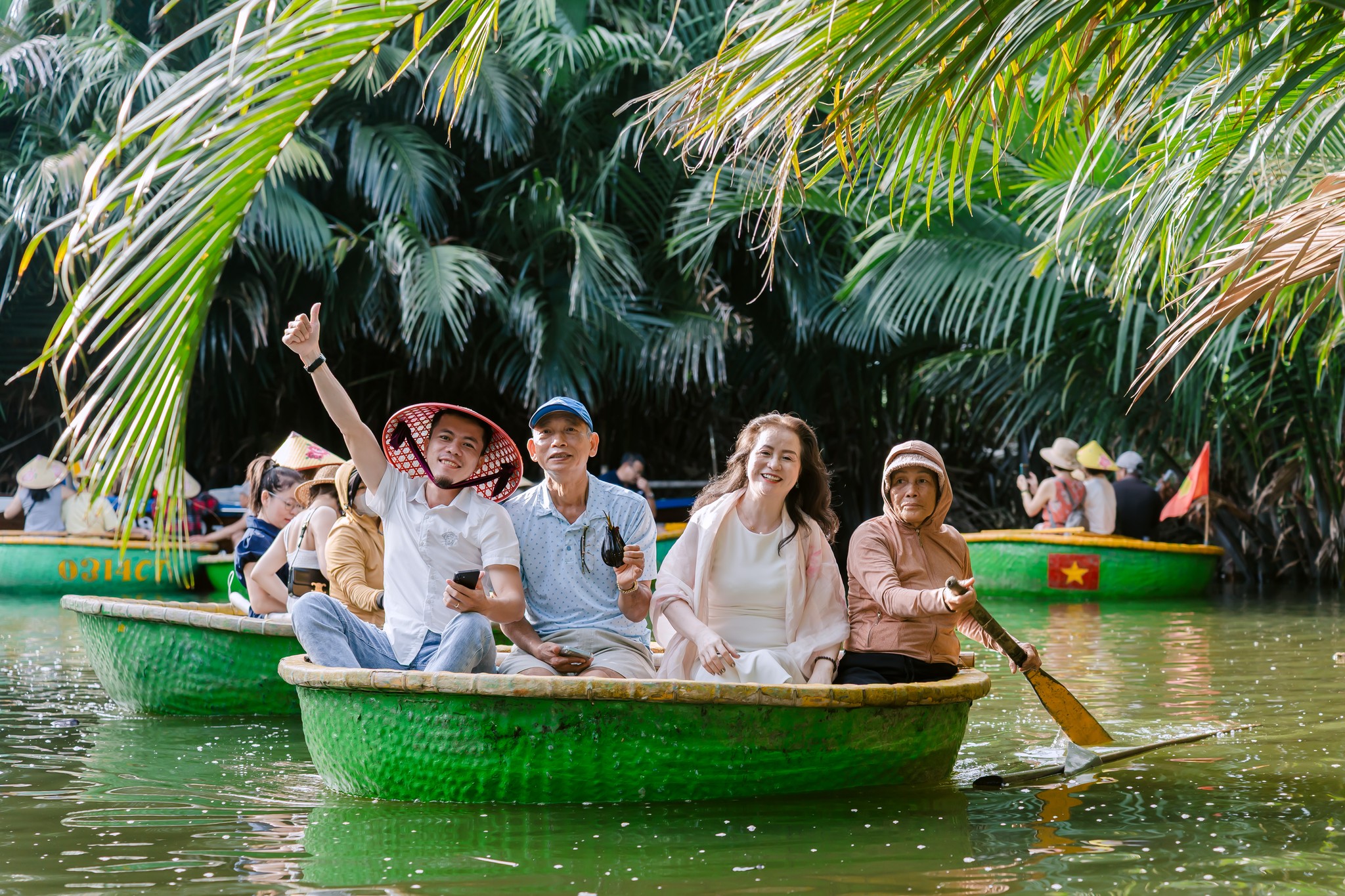 Tiếp đó, khách mời có dịp khám phá Hội An với chuyến đi thuyền thúng trong rừng dừa Bảy Mẫu, tận hưởng khung cảnh làng quê thanh bình.
