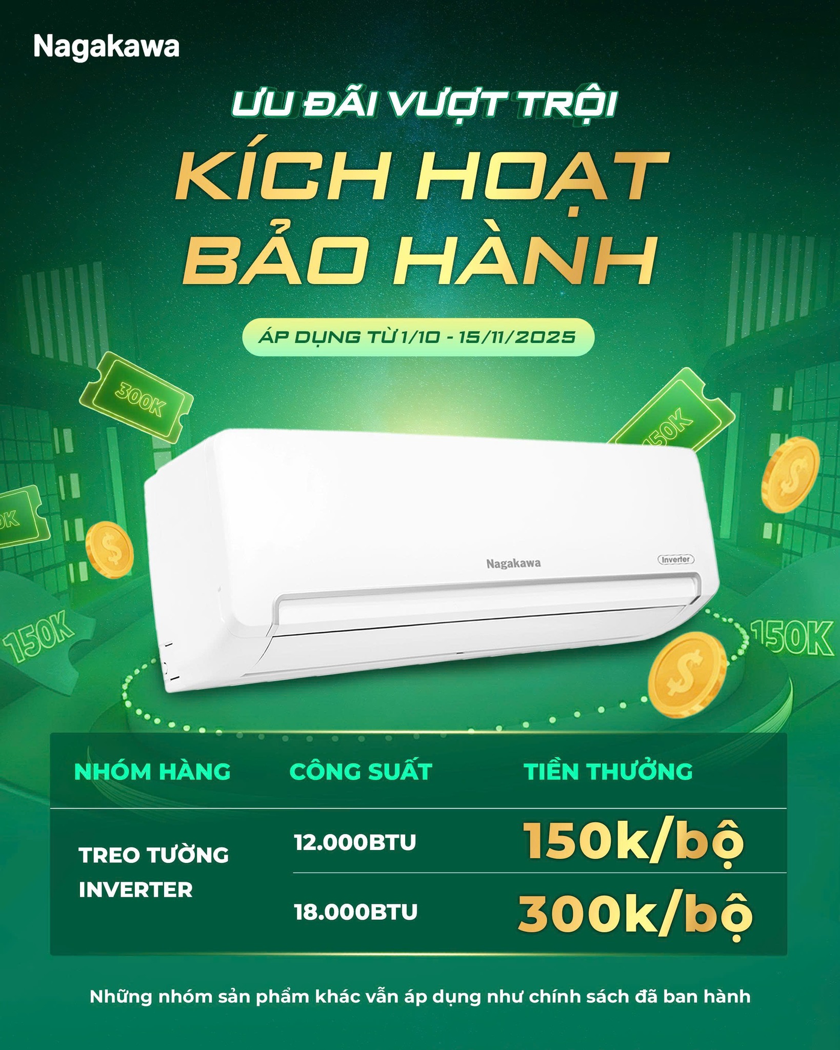 Bên cạnh đó, Nagakawa còn tung ưu đãi vượt trội cho kỹ thuật viên trong chương trình “Kích hoạt bảo hành – Tiền thưởng tẹt ga” áp dụng cho máy điều hòa treo tường Inverter từ ngày 1/10 đến 15/11/2025: